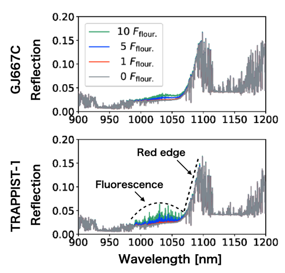 Figure 3 : Reflection spectra of terrestrial planets around GJ667C and TRAPPIST-1 assuming BChl, showing the case of 70% ocean and 30% vegetation, with 1 Fflour. corresponding to the observed fluorescence on Earth. The hypothetical red-edge features are visible, and the large fluorescence contribution around TRAPPIST-1 is due to the absorption bands of stellar VO and FeH. (Credit: Astrobiology Center)