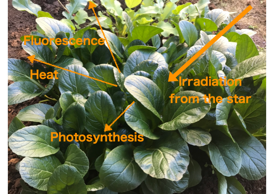 Figure 2 : In photosynthesis, light energy obtained from the Sun is consumed in the form of 1. photochemical reactions, 2. fluorescent emission, and 3. heat dissipation. (Credit: Astrobiology Center)