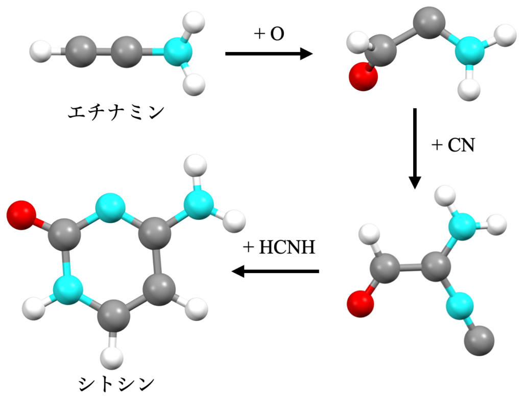The resulting chemical reaction network revealed the following efficient formation pathway by exothermic reaction with no reaction barriers. First, a multi-step reaction pathway was obtained in which a molecule called ethinamine reacts with oxygen O, and then CN and HCNH react to form cytosine. Thus, for the first time, the formation pathway of a molecule related to life was discovered by an automated search calculation using a molecule that could be found in interstellar space, rather than pyrimidine, which has not been found even in meteorites. Although this discovery was obtained by a relatively large calculation, it is still only a part of the picture of nucleobase formation, suggesting that there may be other possible formation pathways from commonplace interstellar molecules. Further multifaceted verification through laboratory experiments and astronomical observations and modeling is needed to determine what the actual abundances are in celestial bodies.