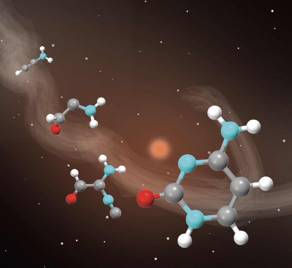 Researchers Yu Komatsu and Daiki Suzuki (currently affiliated with the University of Tokyo) at the Astrobiology Center theoretically predicted the possibility of cytosine molecules, which are nucleobases governing the genetic code in DNA and RNA, being generated from molecules in interstellar space (Figure 1). Through thorough calculations using the automated reaction path exploration method based on quantum chemicals, they discovered a pathway where cytosine could be efficiently produced from interstellar molecules without the conventional intermediate material of pyrimidine molecules. This study was published online in the American scientific journal “ACS Earth and Space Chemistry” on October 11, 2022 (Komatsu and Suzuki, 2022, “Quantum Chemical Study on Interstellar Synthesis of Cytosine by the Automated Reaction Path Search“)